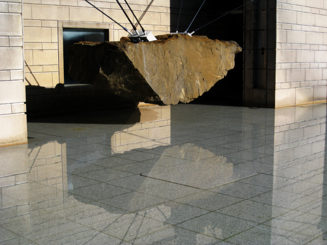 cdc28380.jpegおなじみの?水戸芸術館にある岩のモニュメントです。この写真では水は流れていませんが、普段は水が流れています。それは、水戸にちなんだ「水の戸」つまりは水でできた扉を表しているんだそうです。
